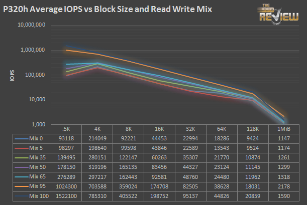 It is somewhat obvious that the P320h is more effective when operations trend more read-heavy. Amazingly, 512 byte IOPS are off the scale at over 1.4 million. That’s…. a lot. Given how much CPU horsepower it takes to generate 1.43 million transactions per second, we’ll have to investigate further a little later on.