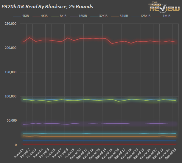 Each 100% write (0% read) operation each round is listed here. After the 128K preconditioning, the P320h is already in steady state by the last few minutes of the first round (where all of the 100% write operations take place). We’re using these results to determine when the P320h hits steady state, and it sure doesn’t take long.