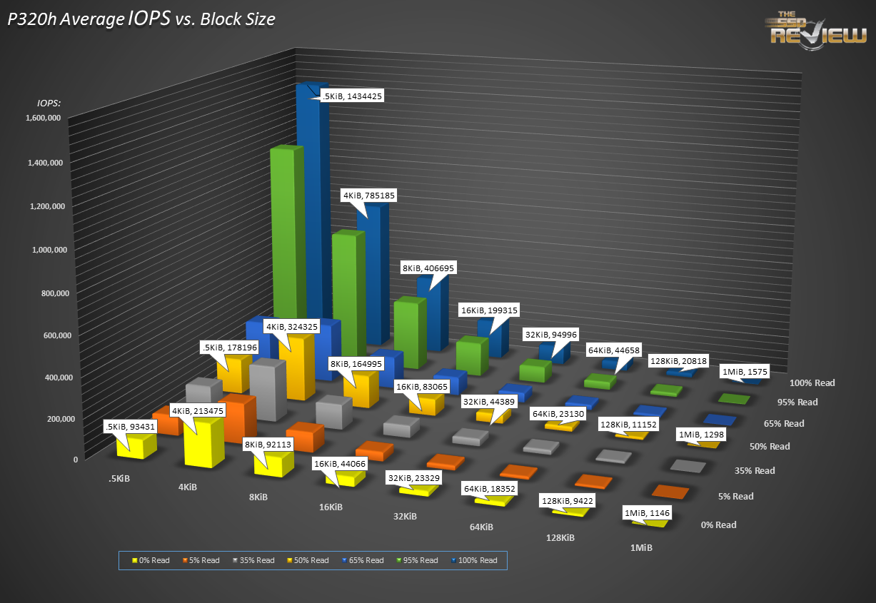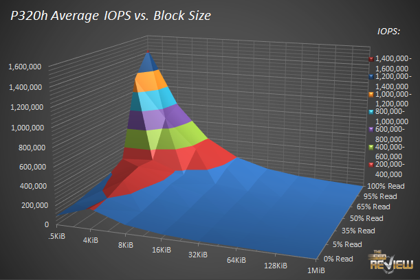 When we switch to the surface chart, it becomes even more evident that the P320h’s insane read performance is throwing off the scale. It looks like Mount Everest, only 1.4 million IOPS high. The write performance is impressive, but reads are just excellent.