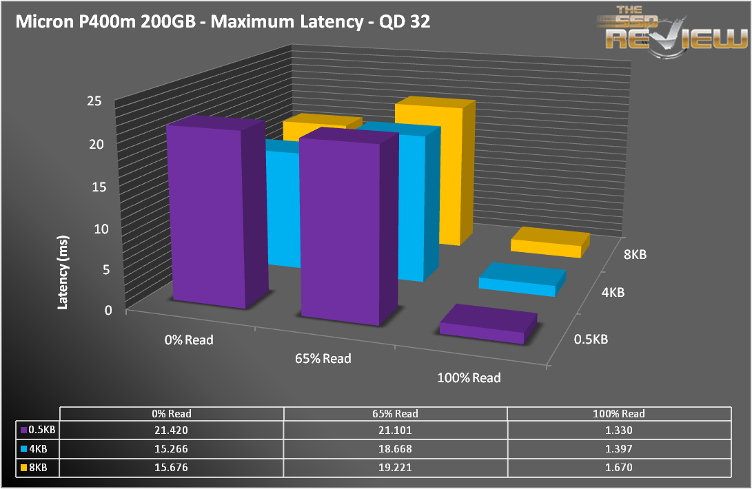 As you transition from 100% reads to 100% writes, the average latency scales nicely. This is not always the case for SSDs. Many times, the mix of read and write operations cause the average latency to be much higher than either extremes. The results of this specific test show that the P400m can handle mixed workloads very well and without any major hiccups.