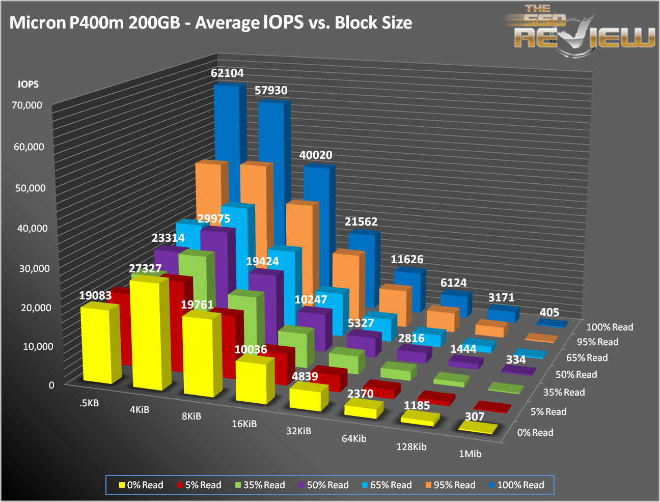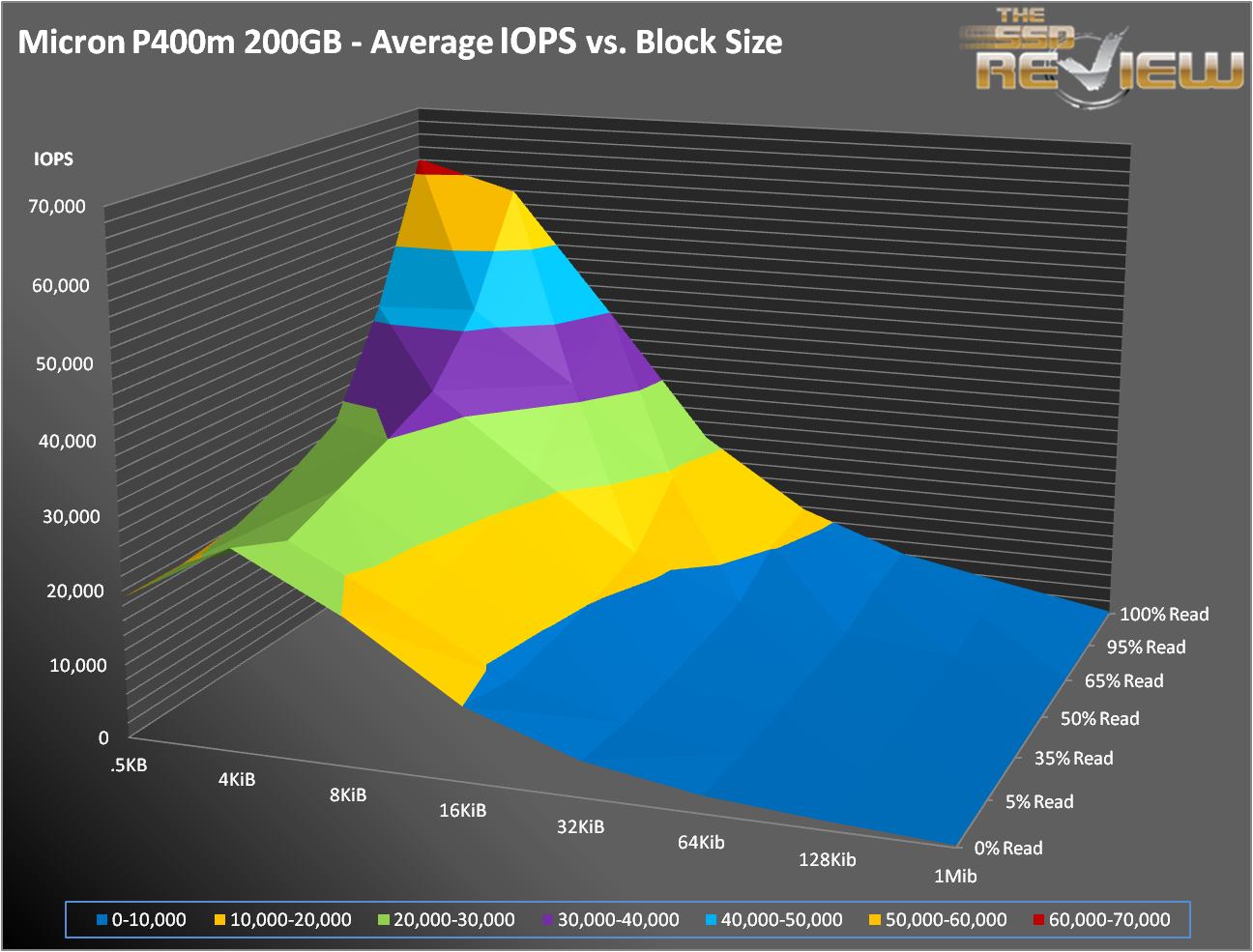 Lets take a look at the surface chart. You can get a good feeling as to how the drive performs and where its strengths and weaknesses lie. Once again, the P400m is a very well-behaved drive. As you can see from the charts above, IOPS increase as you move to the upper left. This is expected as the transfer size decreases and the percentage of writes decrease. You can also see a very prominent ridge extending across the 4KB transfer size, where performance generally decreases on either side.