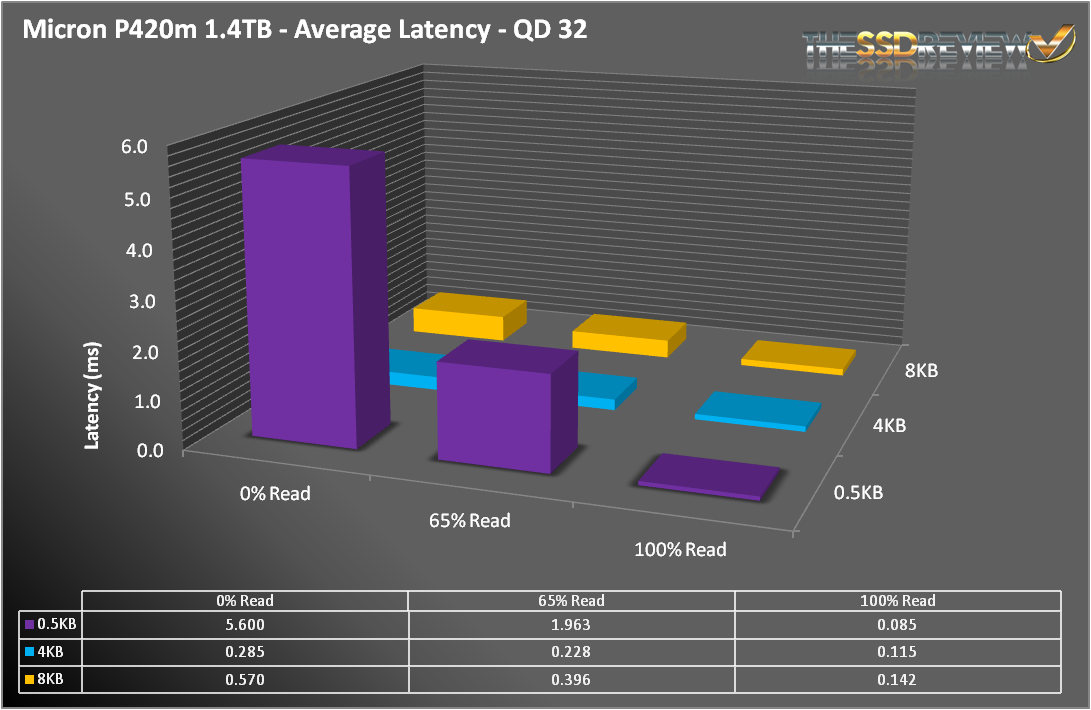 To specifically measure latency, we use a series of 512b, 4K, and 8K measurements. At each block size, latency is measured for 100% read, 65% read/35% write, and 100% write/0% read mixes.