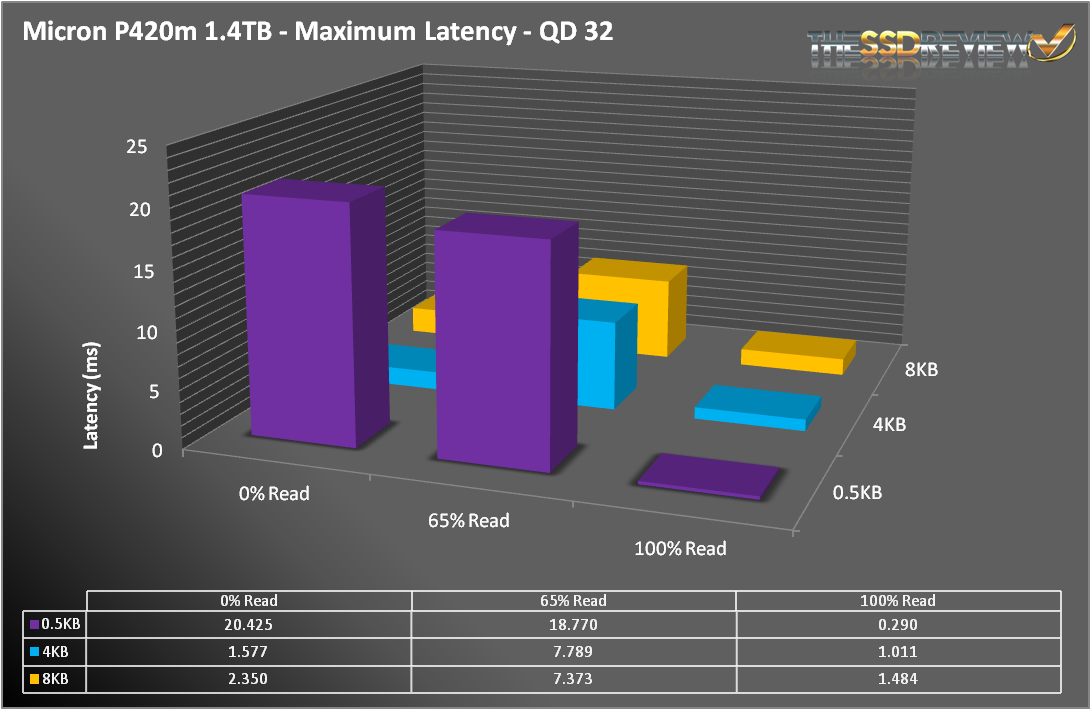 We see the same thing with maximum latency, where 512 bytes latency is off the charts compared to the other metrics. Read latency is particularly impressive, where the maximums were very low.