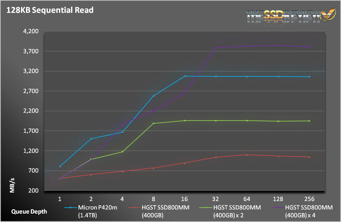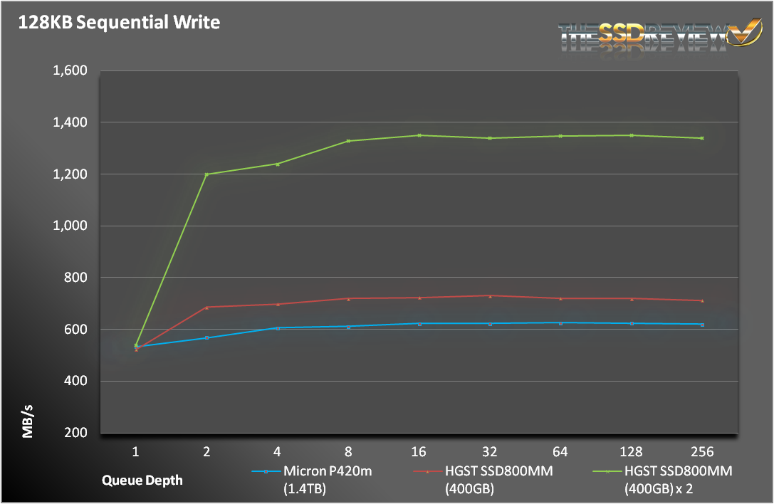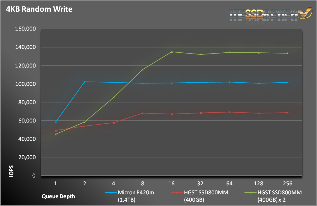For sequential writes, it really isn’t much of a competition. Even a single HGST drive is enough to pass the P420m. With two drives, the SSD800MM puts the P420m in its place. This isn’t much of a surprise considering the P420m is focused on reads, where the HGST setup is more of an all-around performer.