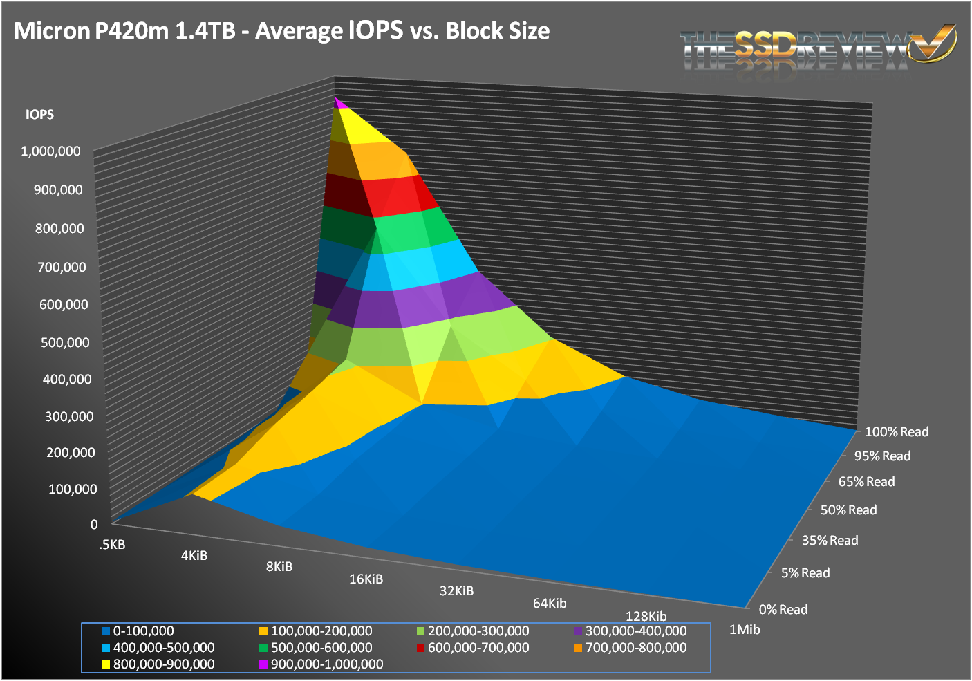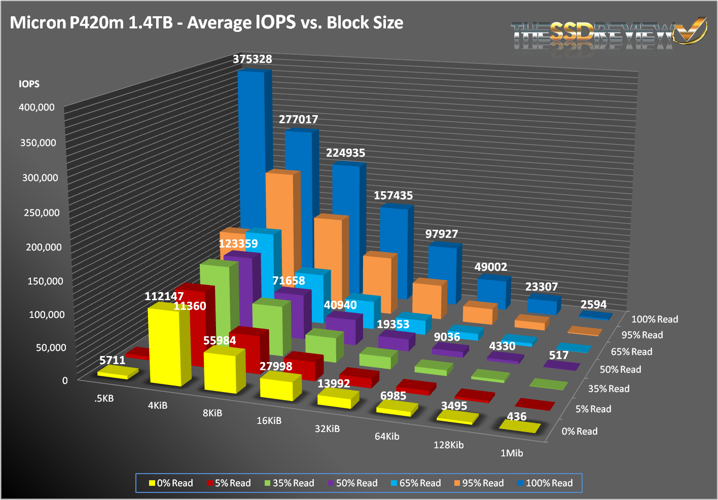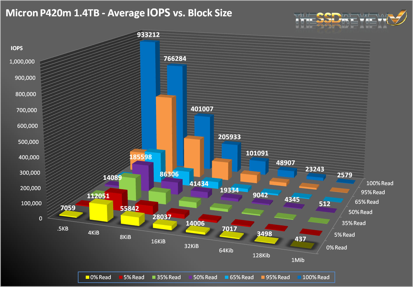 If you remember back to our latency tests, the write performance for 512 byte operations was not very good. Our SNIA tests were no different. In fact, looking across all of the 512 byte access patterns, you see two drastically different results. On the write end, we could only muster 7K IOPS, which is really low. But, on the read end, we hit over 900K IOPS, which is really impressive, but not quite enough to top the 1.4M IOPS that the P320h posted.