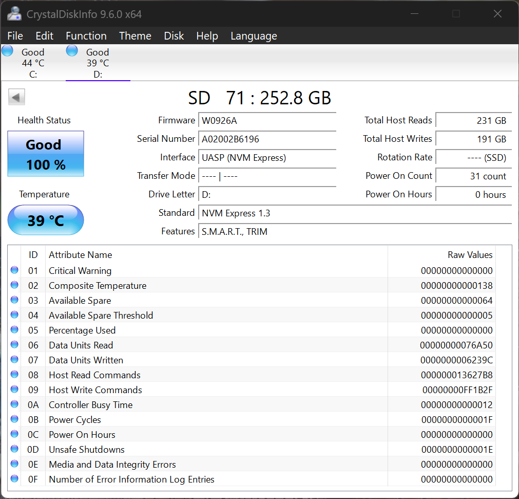 Crystal Disk Info is a great tool for displaying the characteristics and health of storage devices. It displays everything from temperatures, the number of hours the device has been powered, and even to the extent of informing you of the firmware of the device.