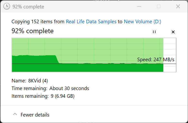 In order to obtain sustained write performance, an 85GB file is transferred from the PC to the microSDXC Express card via the SanDisk Dual Card SD Express Card Pro-Reader. By using this reader, data transfer was achieved while maintaining a suitable card temperature. The sustained write result of the ADATA 256GB Premier Extreme microSDXC card was determined to be 250MB/s.