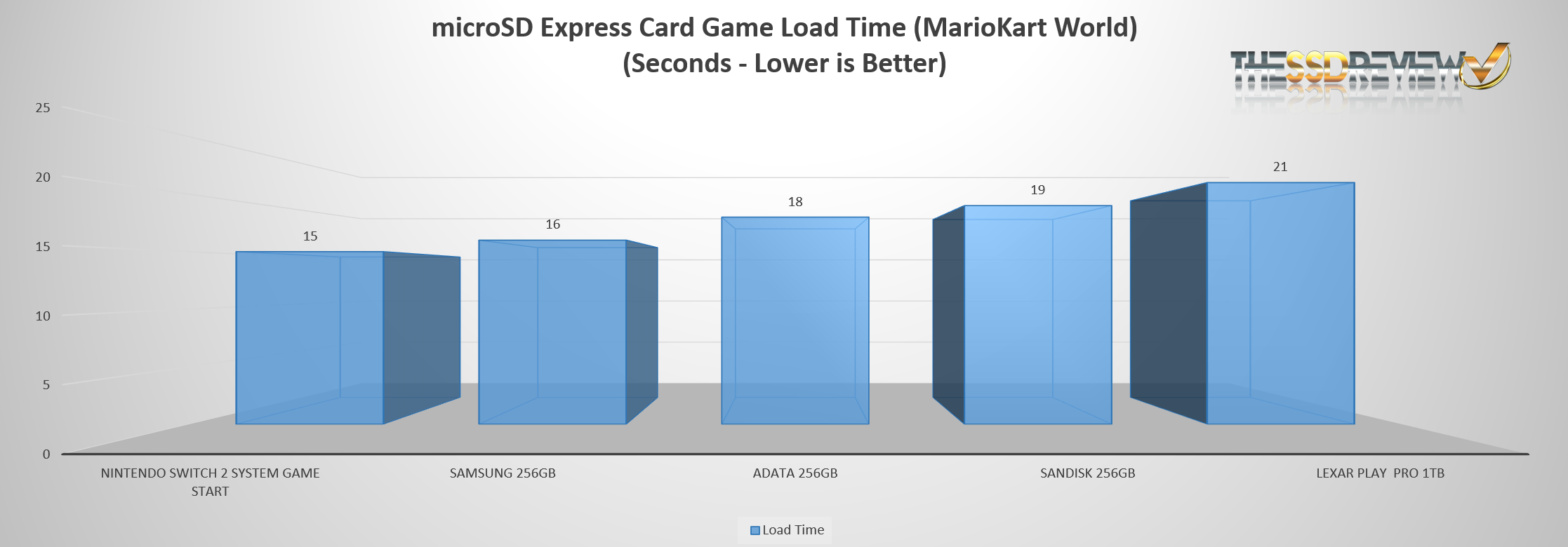 This benchmark entails transfering all game data to the storage card and measuring the time for the game to start, drawing data from that SDXC Express card.