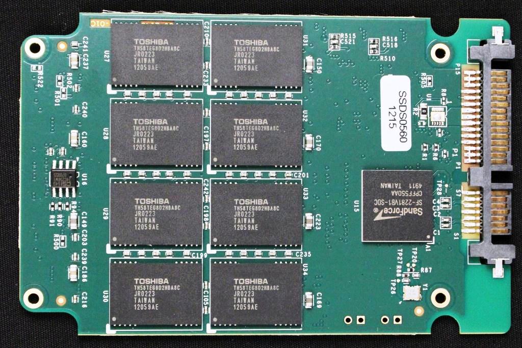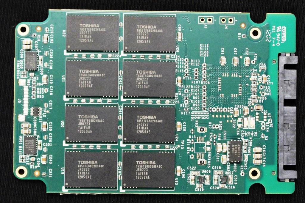 The PCB holds 16 32GB NAND packages of Toshiba Toggle NAND.