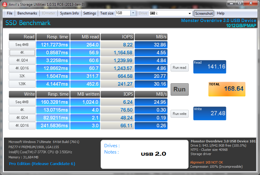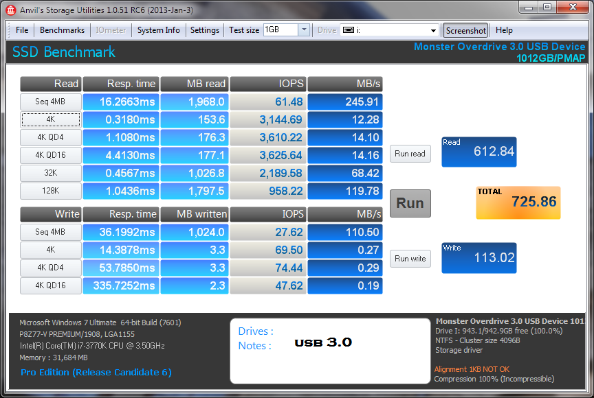 Anvil Storage Utilities clearly demonstrates the massive performance gain when moving to USB 3.0 from USB 2.0.