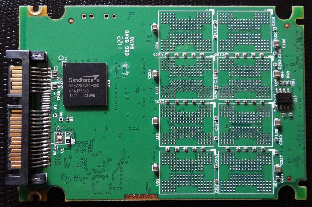 Once opened, we can see the typical green printed circuit board (PCB) as well as the SandForce SF-2281 on the front of the PCB. What is becoming the norm in SSDs these days is the movement back to 3Xnm NAND and placement of eight memory chips on the board rather than 16.