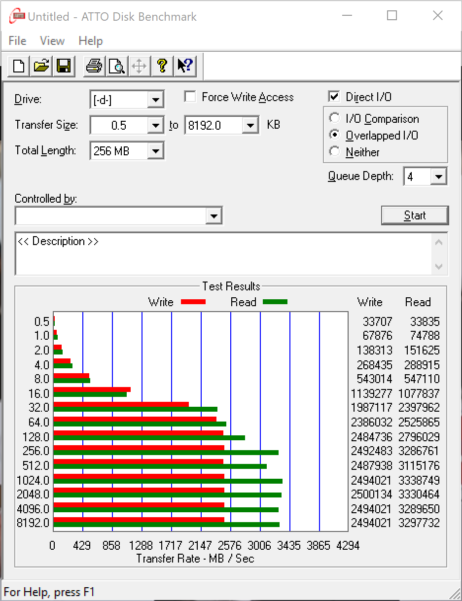 Initial benchmarks are just a bit short of spec with highs of 3.3GB/s read and 2.5GB/s write, however the performance increase as data sample size increase is steady which we like to see.
