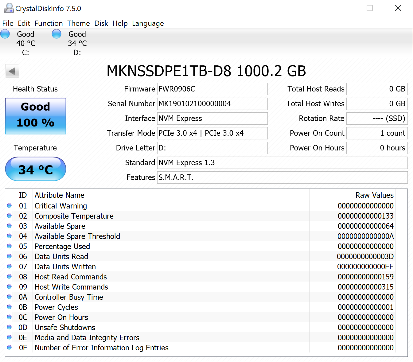 This is what a ‘fresh out of the box’ SSD looks like on CDI, as we can see on the right side. Much confirmed here to include capacity, that it is PCIe 3 x 4 and using NVMe 1,3 protocol.