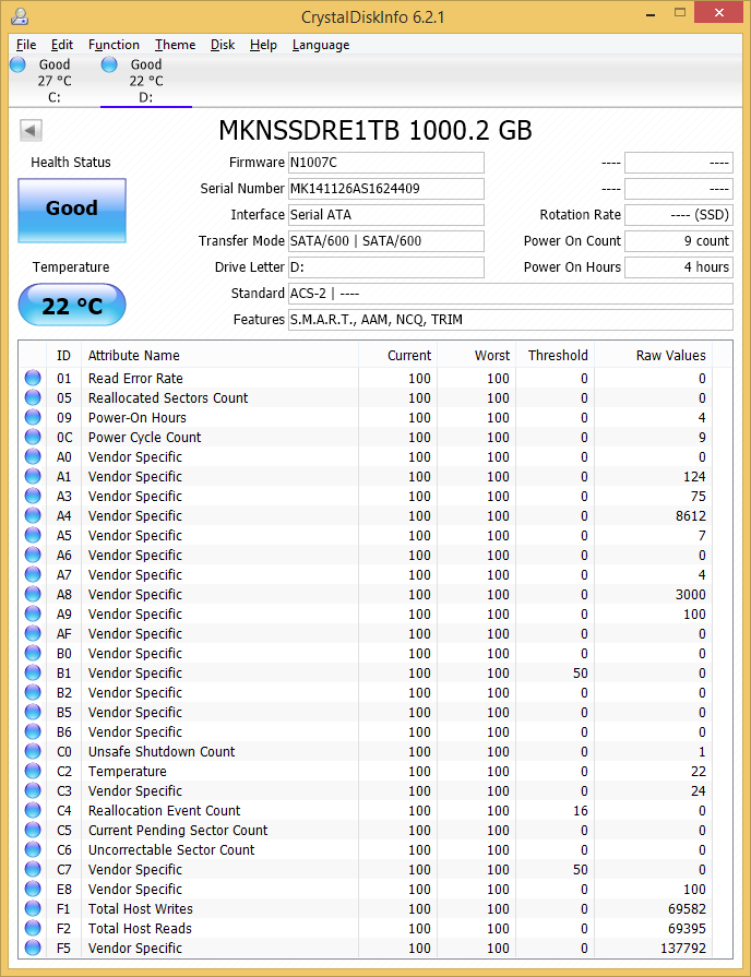Crystal Disk Info is a great tool for displaying the characteristics and health of storage devices. It displays everything from temperatures, to the number of hours the device has been powered, and even to the extent of informing you of the firmware of the device.