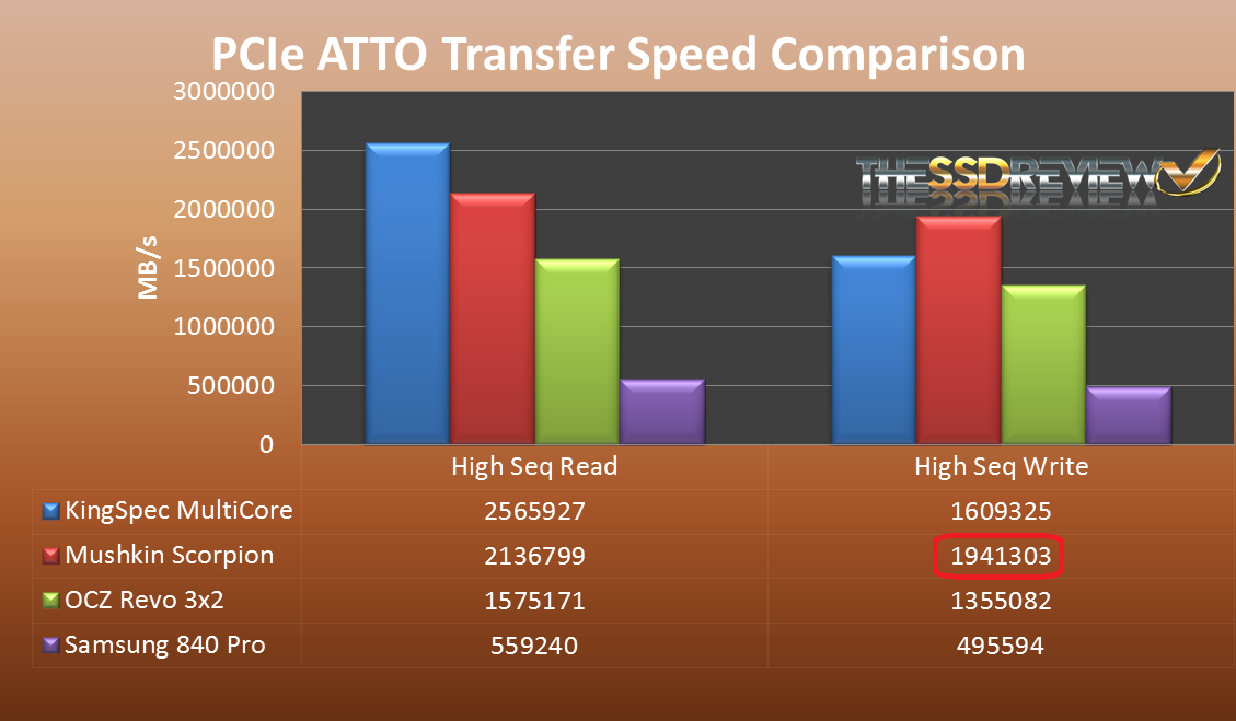 Although the KingSpec is ‘King-of-the-Hill’ at 2.5GB/s read throughput, the Mushkin Scorpion Deluxe handily surpassed it in write performance at 1.9GB/s which was totally unexpected. Considering we have had (and used) this OCZ Revo 3×2 for a few years now, it still provides amazing performance. Just for good measure, we also included results of the Samsung 840 Pro SSD as a point of comparison.