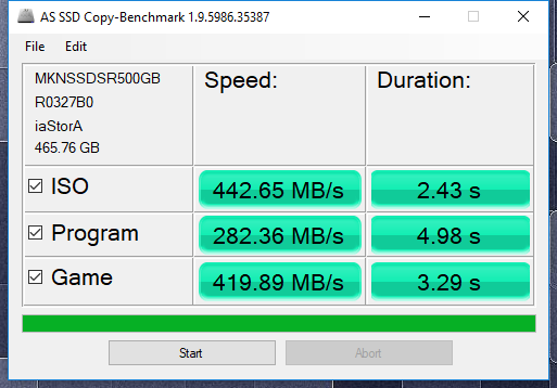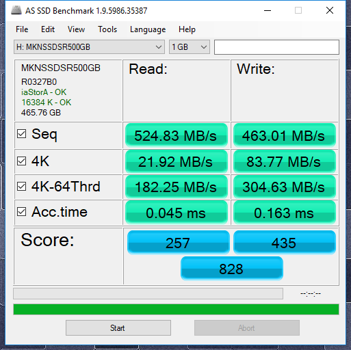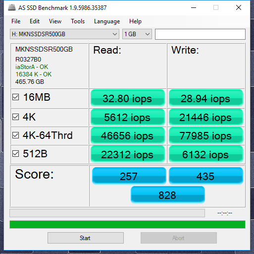 In AS SSD the Mushkin Source delivers an overall score of 828 points. Sequential performance reports as 524MB/s read and 463MB/s write. The random performance came in at 46K IOPS read and 77K IOPS write. During the copy test, the Source delivered respectable results. In the game and ISO portions of the test, its throughput was over 400MB/s and during the program portion, it was just under 300MB/s.