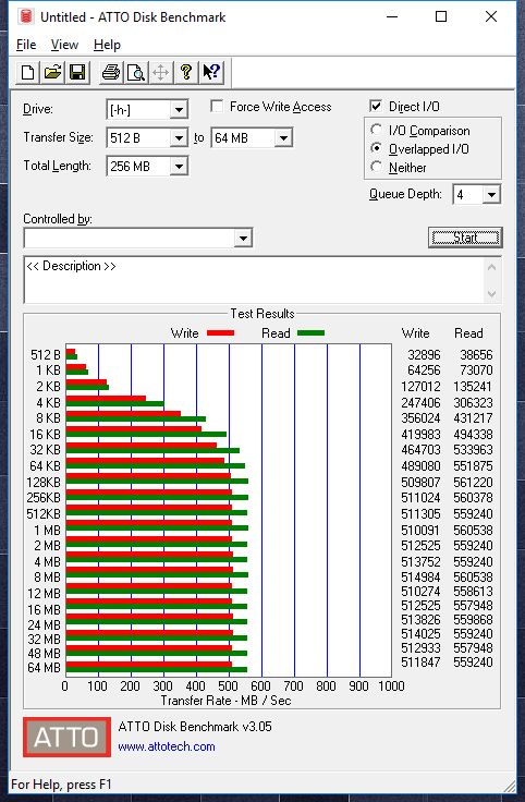 ATTO Disk Benchmark is perhaps one of the oldest benchmarks going and is definitely the main staple for manufacturer performance specifications. ATTO uses RAW or compressible data and, for our benchmarks, we use a set length of 256mb and test both the read and write performance of various transfer sizes ranging from 0.5 to 8192kb. Manufacturers prefer this method of testing as it deals with raw (compressible) data rather than random (includes incompressible data) which, although more realistic, results in lower performance results.
