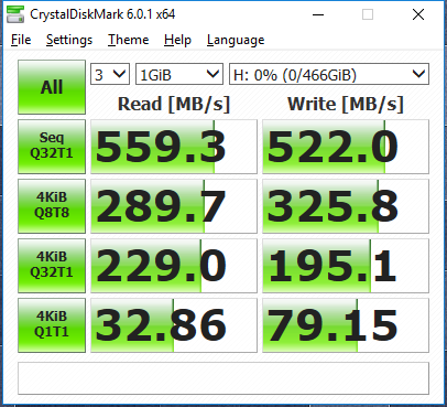 In Crystal Disk Mark the Mushkin Source delivers 559MB/s read and 522MB/s write performance, matching the rated specs. It also delivers 4KiB speeds of 32.86MB/s read and 79.15MB/s write at QD 1.
