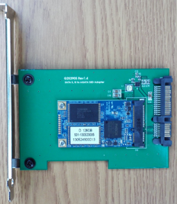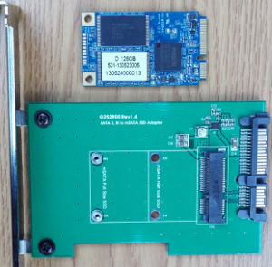 In the next images, we see the adapter with the mSATA SSD above it for size comparison, then the adapter with the mSATA SSD installed, and finally a close-up of the installed SuperCache 2 mSATA SSD.