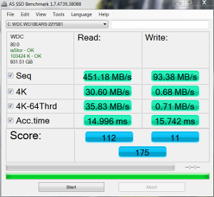 When we turn caching on, the AS SSD sequential read speeds shoot up to 451.18 MB/s, with 4K-64 thread read speeds accelerating to 35.83 MB/s. Once again, we see little or no improvement in write speeds. Sequential write speeds of 93.38 MB/s, and 4K-64 thread write speeds of 0.71 MB/s are literally no improvement whatsoever. The resultant score increase from 29 to 175 is driven strictly by the read speed increases. Read IOPS improved to 9172, and write IOPS barely ticked upward to 181 IOPS. Read IOPS did improve, but not to what can be considered SSD-like. This could also partially be the result of AS SSD’s “worst case scenario” nature.