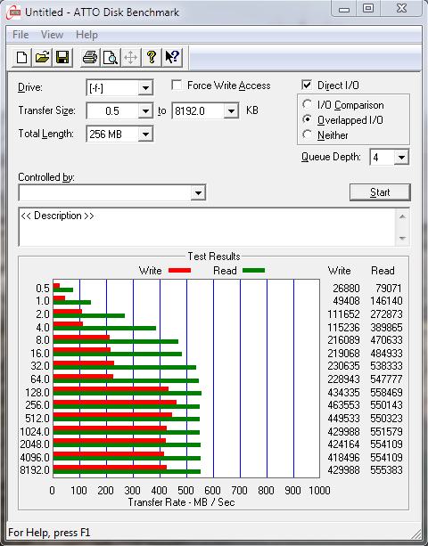 ATTO Disk Benchmark is perhaps one of the oldest benchmarks going and is definitely the main staple for manufacturer performance specifications. ATTO uses RAW or compressible data and, for our benchmarks, we use a set length of 256mb and test both the read and write performance of various transfer sizes ranging from 0.5 to 8192kb. Manufacturers prefer this method of testing as it deals with raw (compressible) data rather than random (includes incompressible data) which, although more realistic, results in lower performance results.