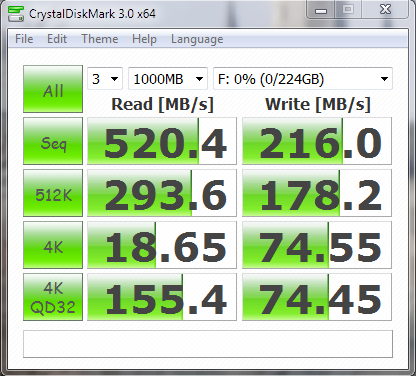 Although the sequential read transfer speed of 520MB/s is one of the highest we have seen in Crystal DiskMark yet, the high sequential write performance of 216MB/s left us wanting higher performance but is typical of what is normally seen when implementing new NAND flash memory. Looking back at the BP3 we reviewed previously, we can see that the overall performance of the BP4 is much better, however, the high sequential write performance of the BP3 was 314MB/s with the Toshiba 24nm Toggle Mode memory. Conversely, the BP4 displays much better low 4k random write performance at 74MB/s.
