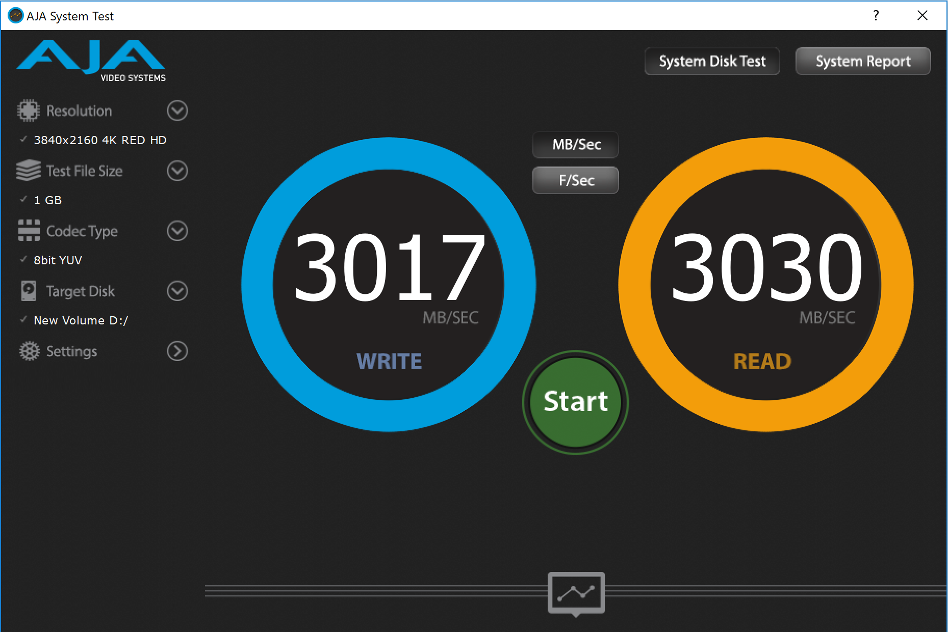 The AJA Video Systems Disk Test is relatively new to our testing and tests the transfer speed of video files with different resolutions and Codec.