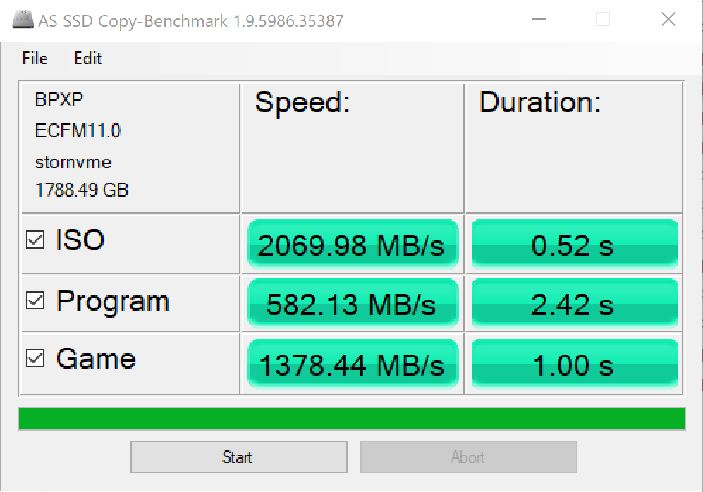 Looking at the throughput result of AS SSD, we can see that the high sequential results are a bit lower, as they normally might be with this software, but it is surprising to see the low 4k random performance actually better than the previous Crystal DiskMark result. IOPS are also decent at 439K read and 593k write.
