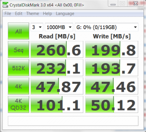 Surprisingly, the high sequential scores are pretty good considering that this is the toughest of synthetic benchmarks that we can throw at the MyDigitalSSD ‘Bullet Proof” SSD. Once again though, take a close look at the 4k read result which confirms that of Crystal DiskMark above.