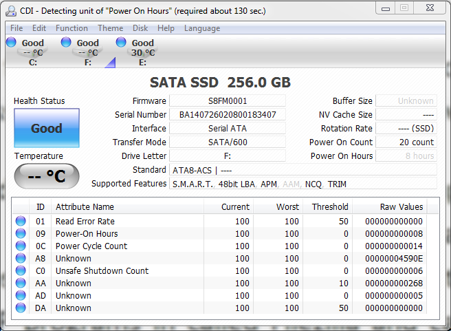 Even with the limited attribute count, we can still verify that this is SATA 3, 256GB in size and that it is TRIM capable as well as the Power On and Power On Hours count.