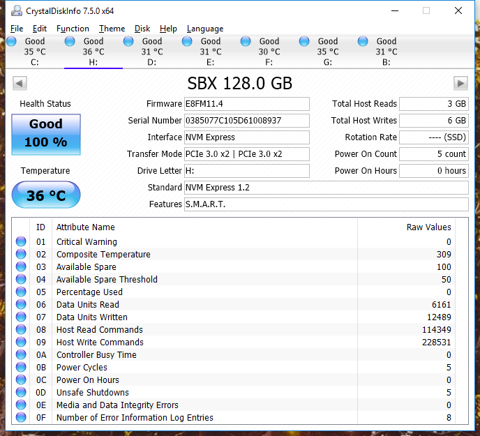 Crystal Disk Info reports all attribute names, none are “vendor-specific.” We can see that the total hose reads and writes counters work as well as the power on count and hours. There is also a working temperature sensor and CDI confirms the PCIe 3.0 x2 transfer mode. The firmware we are testing today is E8FM11.4.