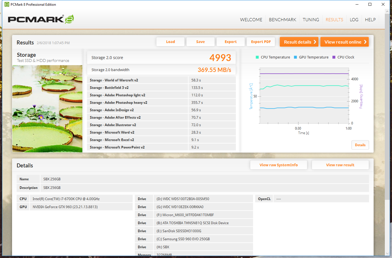 The SSD Review uses PCMark 8’s Storage test suite to create testing scenarios that might be used in the typical user experience. With 10 traces recorded from Adobe Creative Suite, Microsoft Office and a selection of popular games, it covers some of the most popular light to heavy workloads. Unlike synthetic storage tests, the PCMark 8 Storage benchmark highlights real-world performance differences between storage devices. After an initial break-in cycle and three rounds of the testing, we are given a file score and bandwidth amount. The higher the score/bandwidth, the better the drive performs.