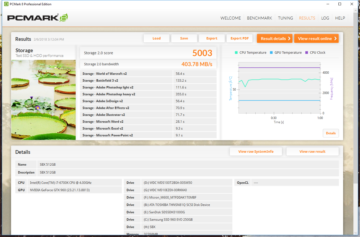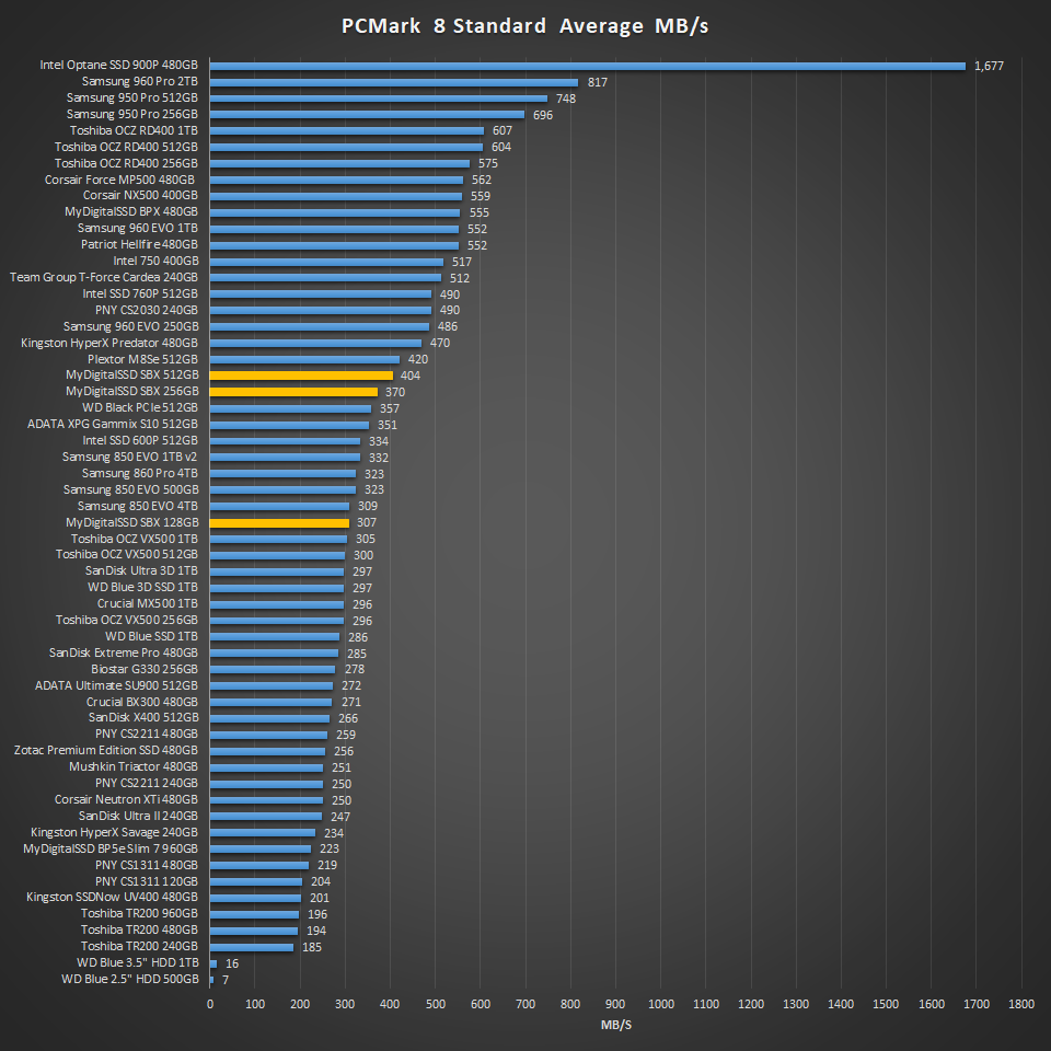 In PCMark 8 the MyDigitalSSD SBX scored 4965, 4993, and 5003 points and averaged 307, 370, and 404MB/s in bandwidth.