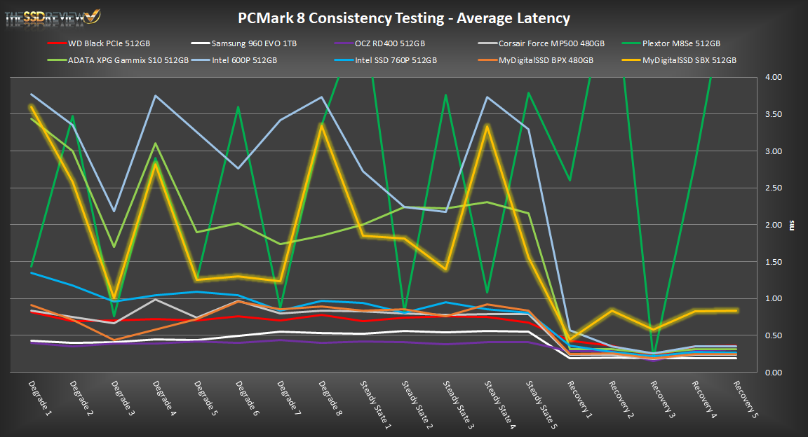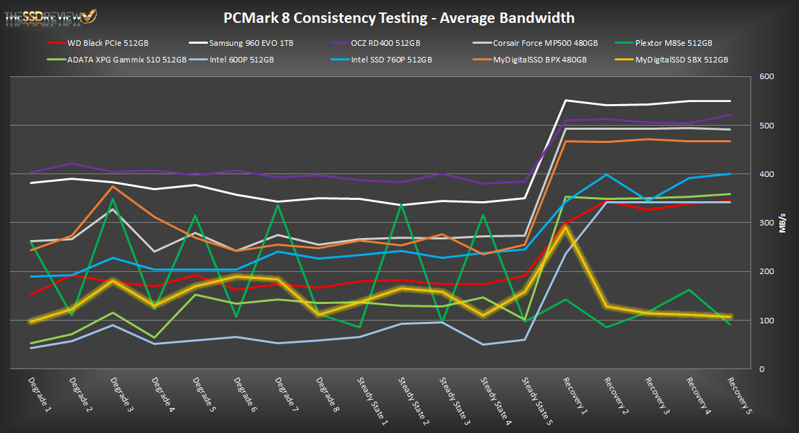 Just like many other entry-level SSDs, the MyDigitalSSD SBX lacks consistent performance in PCMark 8 Extended. During the heavy workload phases (degrade and steady-state rounds), the SBX shows latency spikes from 1.25-3.5ms and averages about 150MB/s in bandwidth. During the light workload phases (recovery rounds), the SBX is unable to recover quickly and its performance lags behind the rest of the pack, matching the Plextor M8Se’s performance for the most part.
