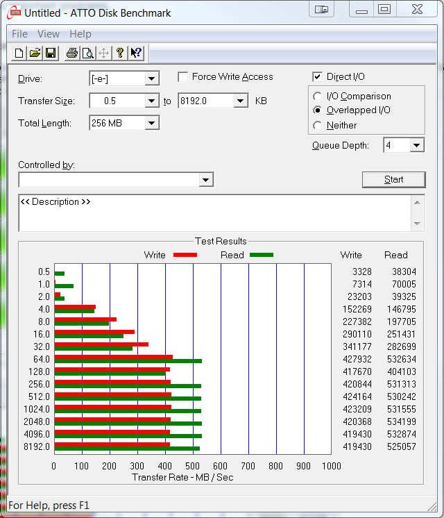 ATTO Disk Benchmark is a relatively easy-to-use benchmark tool, which happens to be the benchmark of choice for many manufacturers. ATTO uses compressible data rather than random data, which results in higher performance and thus, higher benchmark scores. In our testing, we have selected the transfer size to range from 0.5KB to 8192KB, and have set the total length of the test to be 256MB.