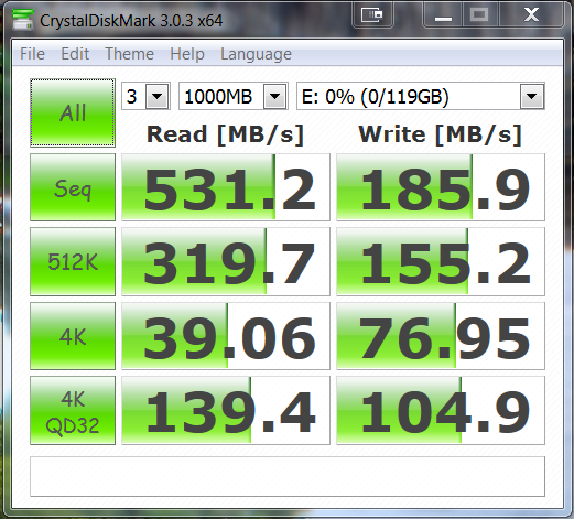 Crystal results were similar regardless of testing sample makeup and we were just a bit disappointed in the write performance, knowing of course that we are using a Phison controller and only two modules of memory. It was really a given and even Phison representatives would quickly point out that the intended direction for the SC2 family is that of a caching SSD,
