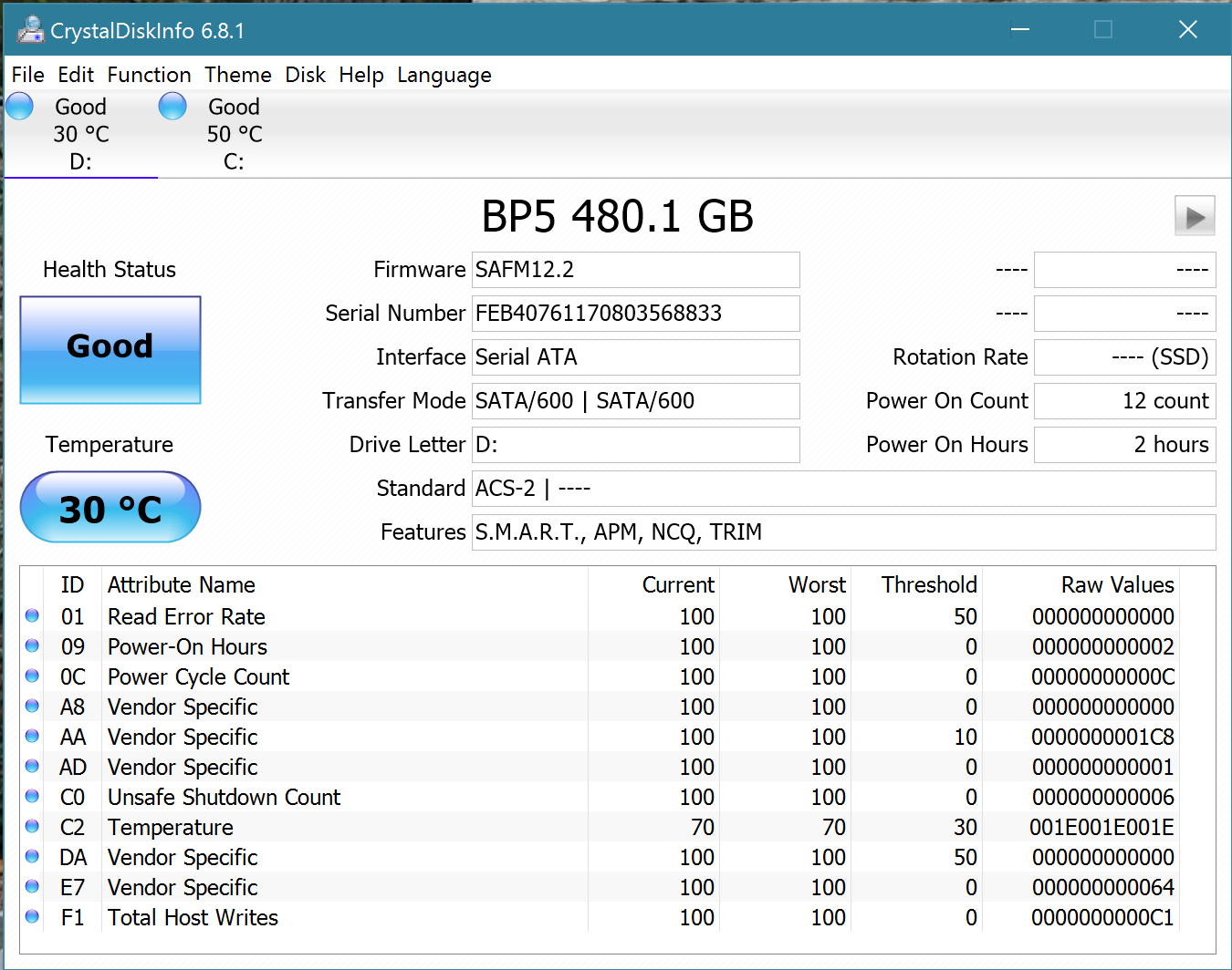 Crystal Disk Info is a great tool for displaying the characteristics and health of storage devices. It displays everything from temperatures, to the number of hours the device has been powered, and even to the extent of informing you of the firmware of the device.