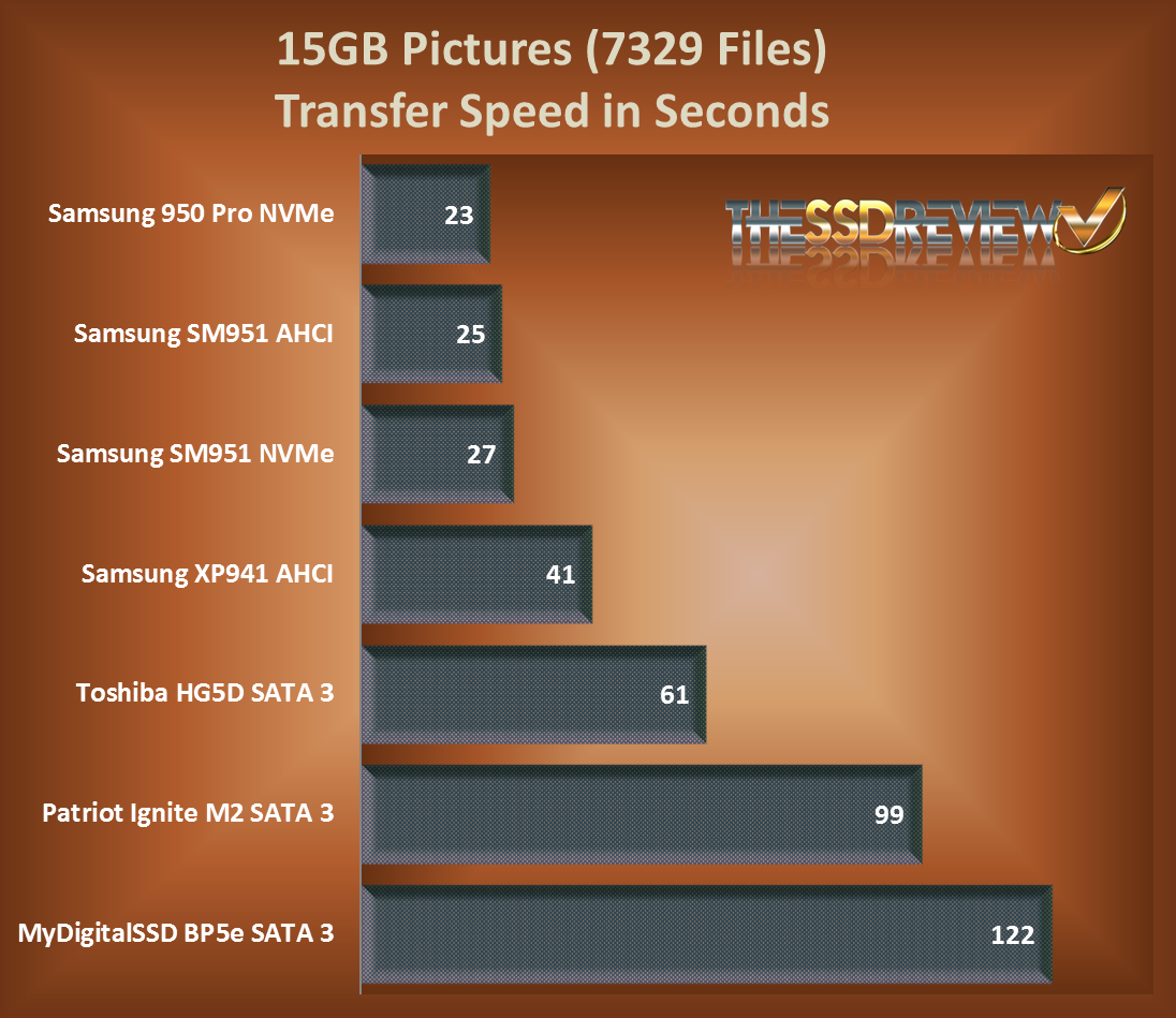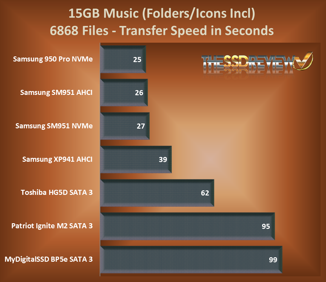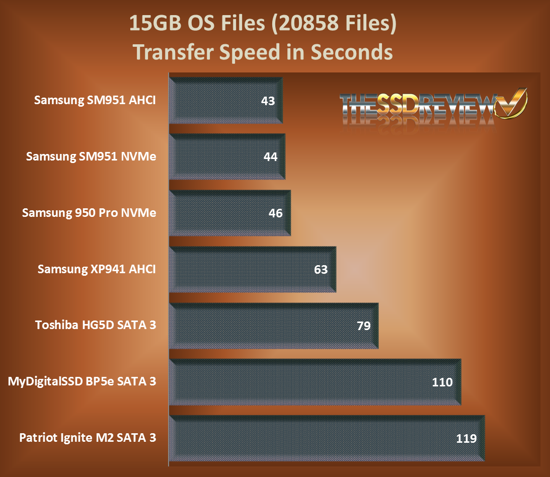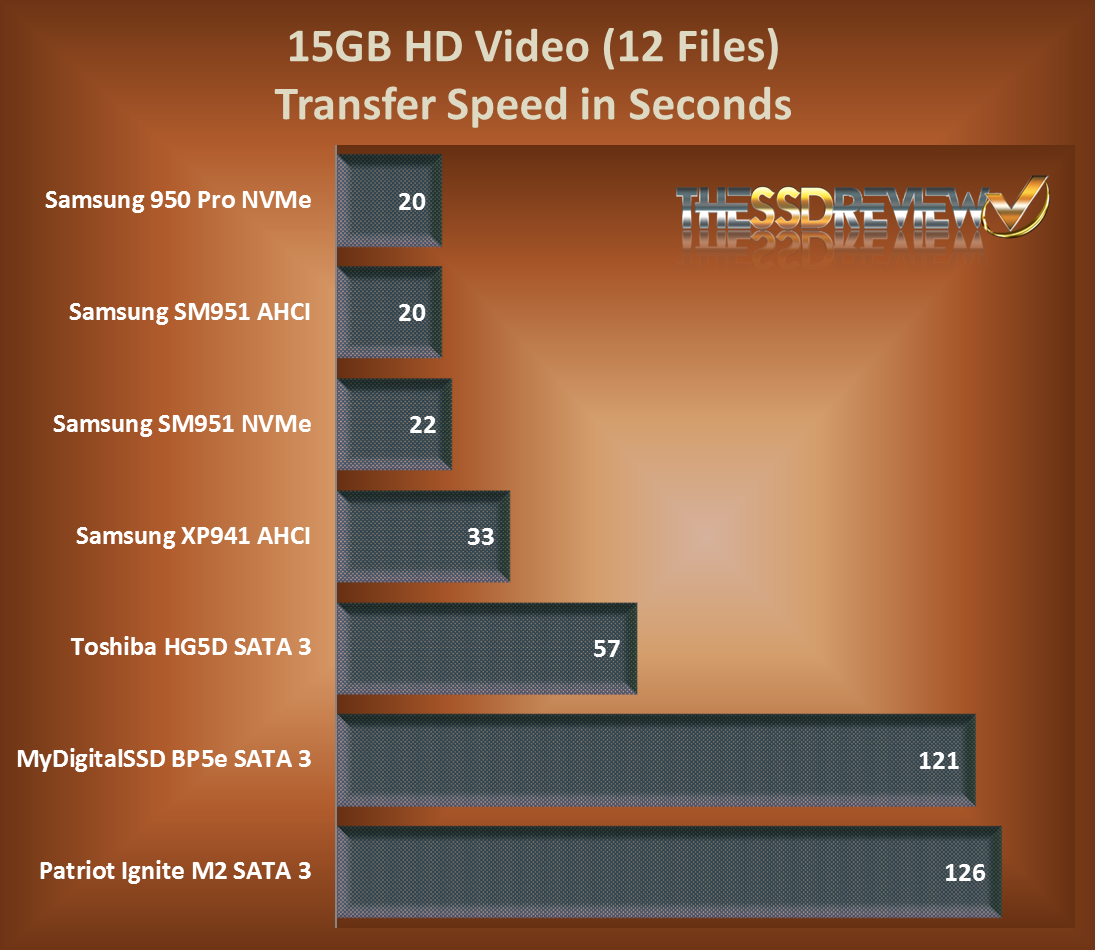 For today’s report, we thought we might do a bit of true transfer speed testing with files that one would typically transfer in their own system. All files, in fact, come from my own system and consist of 15GB samples of video, music, pictures and OS files. All files would be moved from the systems SSD to that of the SSD being tested and each file then moved from one spot on that SSD to another and timed. Just for the fun of it, we thought we might include some pretty impressive AHCI PCIe and NVMe SSDs as well as the SATA 3 M.2 SSD counterparts.
