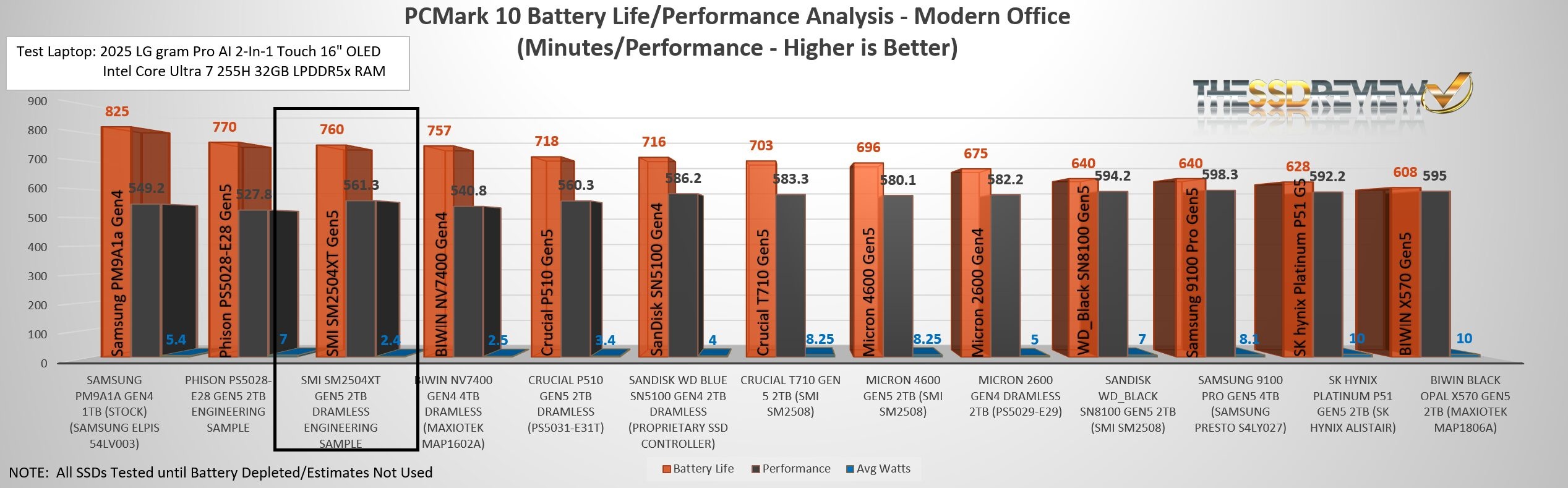 We already knew the SM2504XT would not stand up to the speed of such power hungry SSDs as the Samsung Pro 9100, SanDisk SN8100 and Crucial 710, but that wasn’t our interest. We were seeking the best laptop SSD in the world. For that, we needed to find a fast, cool running SSD that would achieve great battery life. We spent days conducting in depth laptop battery testing and this was the result. You can click on the chart to enlarge: