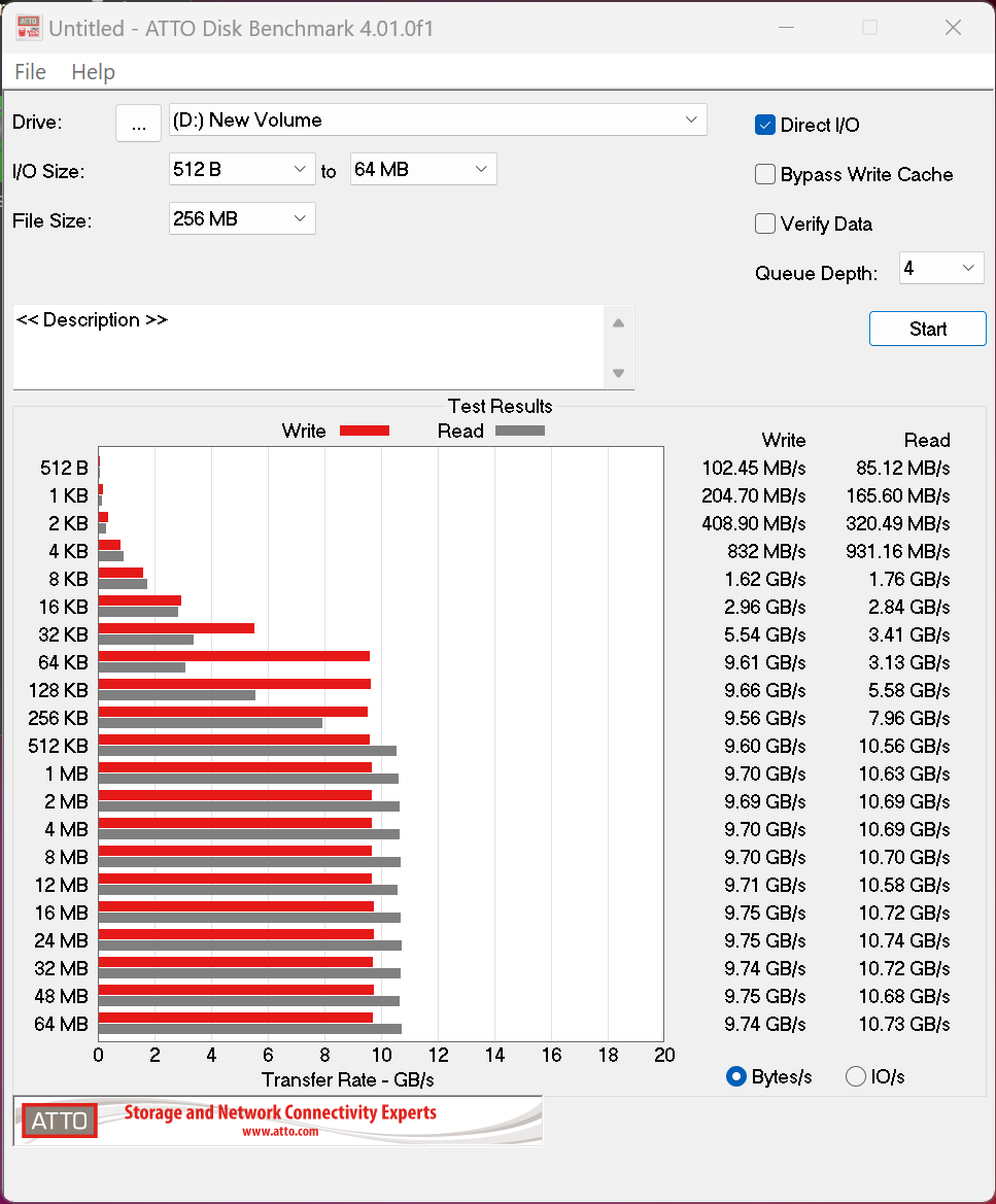 ATTO performance hits highs of 10.73GB/s read and 9.75GB/s write which is below listed specs as is the norm for ATTO.