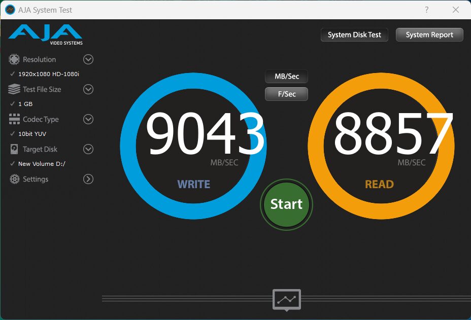 The AJA Video Systems Disk Test is relatively new to our testing and tests the transfer speed of video files with different resolutions and Codec.