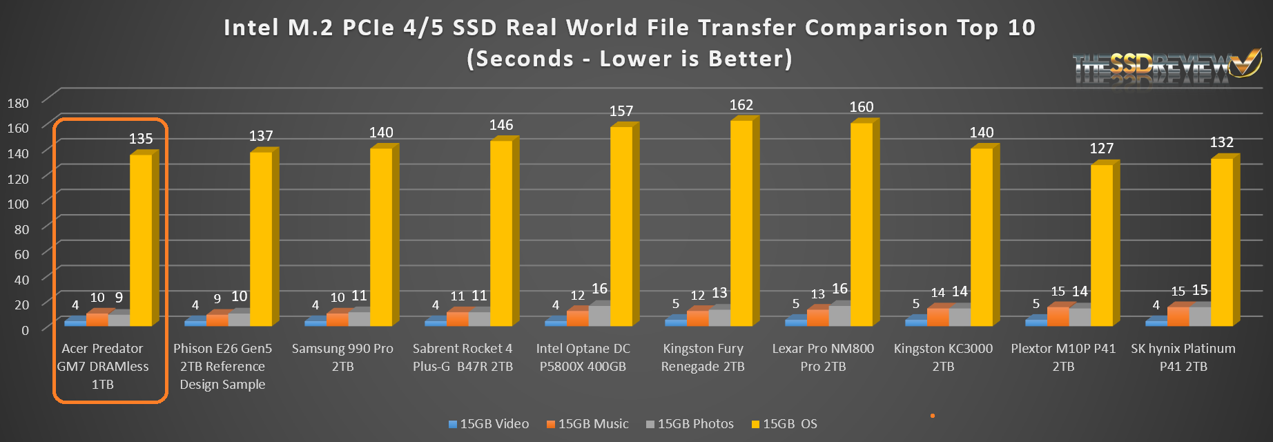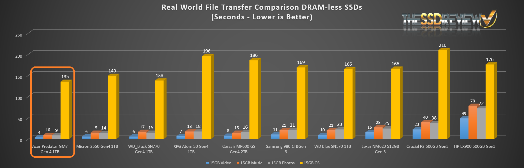 Never expected this whatsoever and I am still stunned! As much as I could see great results in the transfer of videos, photos and music, I never expected to see OS data transferred this fast by a DRAMless SSD. The Acer Predator literally blew through our true data testing regimen. Just as a bit of further idea where we have come in DRAMless SSDs, we posted DRAMless SSD results as well in the chart below.