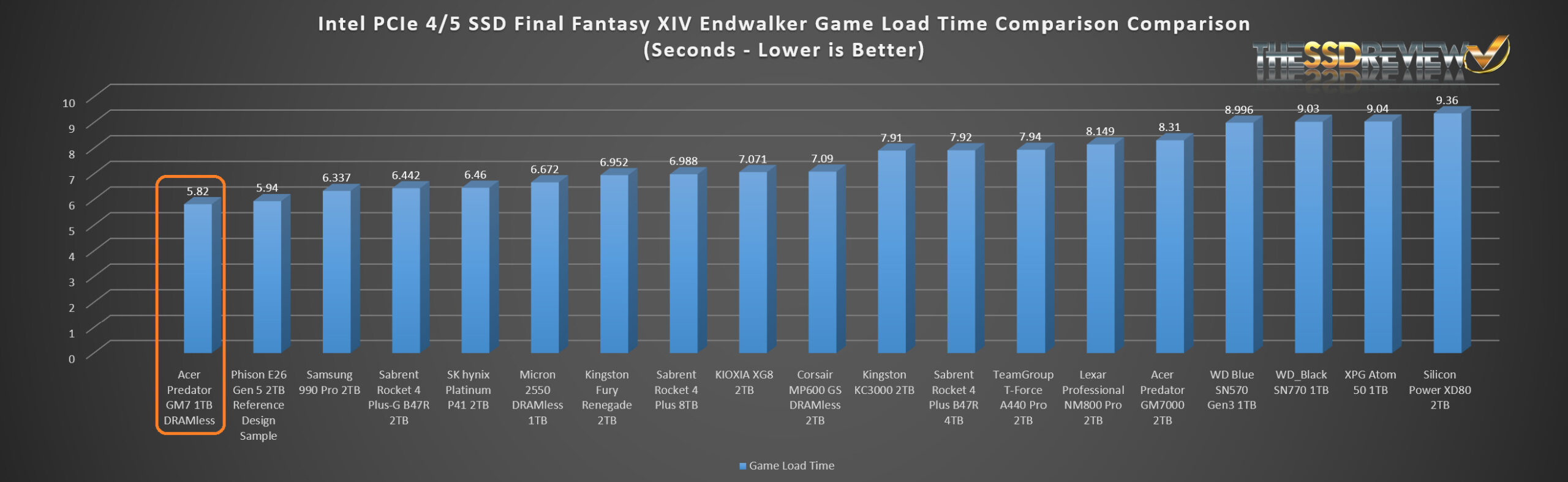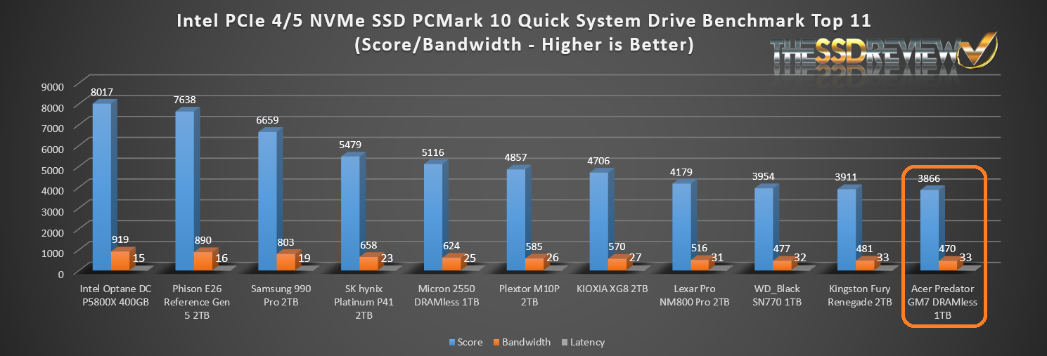The Acer Predator dropped just a bit in our PCMark 10 Quick Test so we extended this result to the ‘Top 11’ for this report. We thought this deserving as the Acer Predator had still placed ahead of 15 other SSDs.