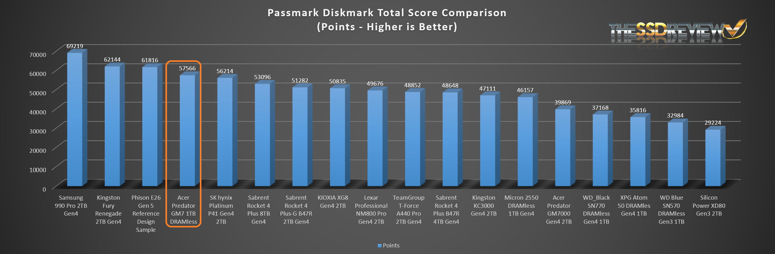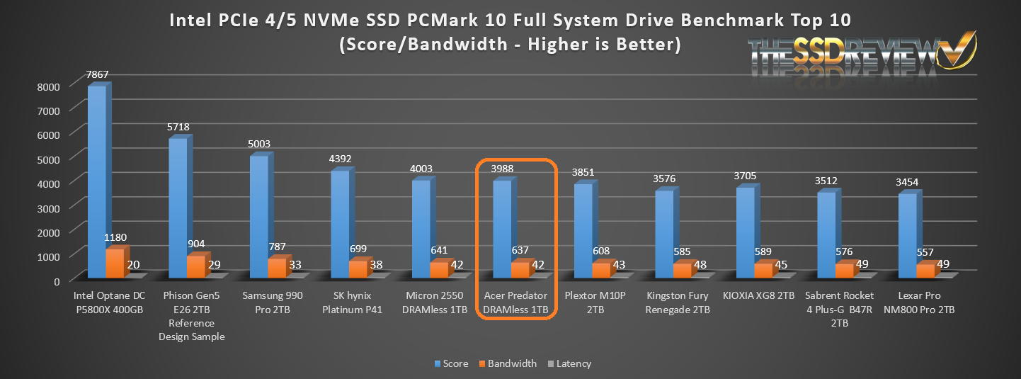 Both recent DRAMless SSD releases (Micron 2550 and Acer Predator) have placed very well in our PCMark 10 Full System test and one might think both were tested with our new 13th Gen Test Bench. The 2550 was actually tested in our former 12th Gen Test Bench; DRAMless SSDs appear to be stepping up in performance.