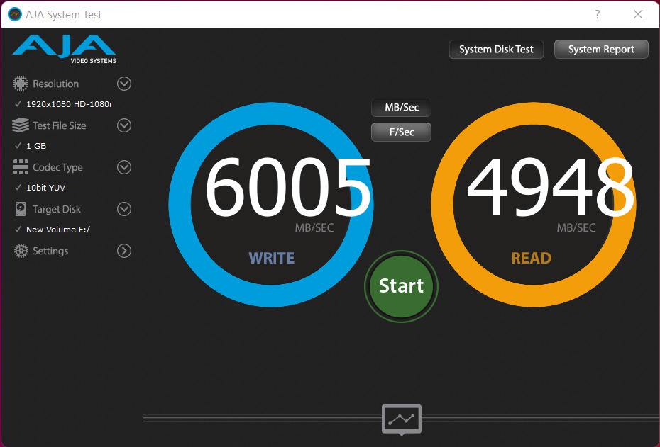 The AJA Video Systems Disk Test is relatively new to our testing and tests the transfer speed of video files with different resolutions and Codec.