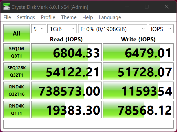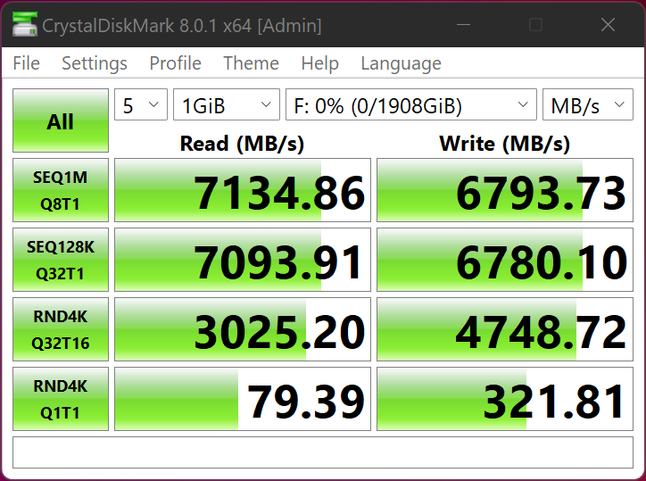Crystal DiskMark results are very strong with over 7GB/s throughput and 1 million IOPS.