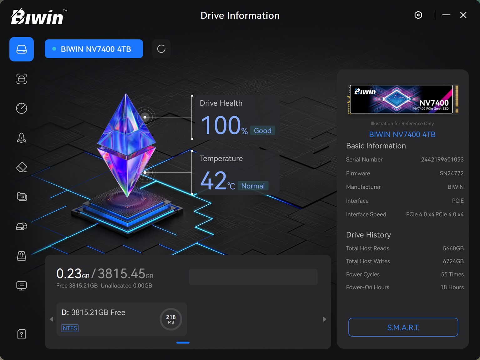 Totally unexpected was BIWIN’s newest SSD maintenance software which is a free download. It has several selections at the left menu to include Drive Information, Error Scan (Quick or Deep Scan), Performance Test, Drive Erase (Includes Secure Erase), Data Migration, Drive Cloning, Firmware Update, System Information and a Help selection.