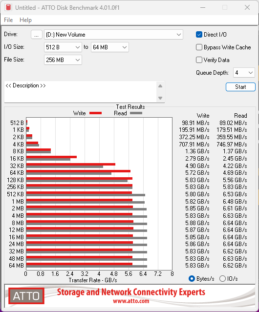 The BIWIN Black Opal NV7400 Gen4 SSD reaches ATTO speeds of 6.64GB/s read and 5.83GB/s write which is fairly decent. It demonstrates its quality with steady performance progression as data size increases.