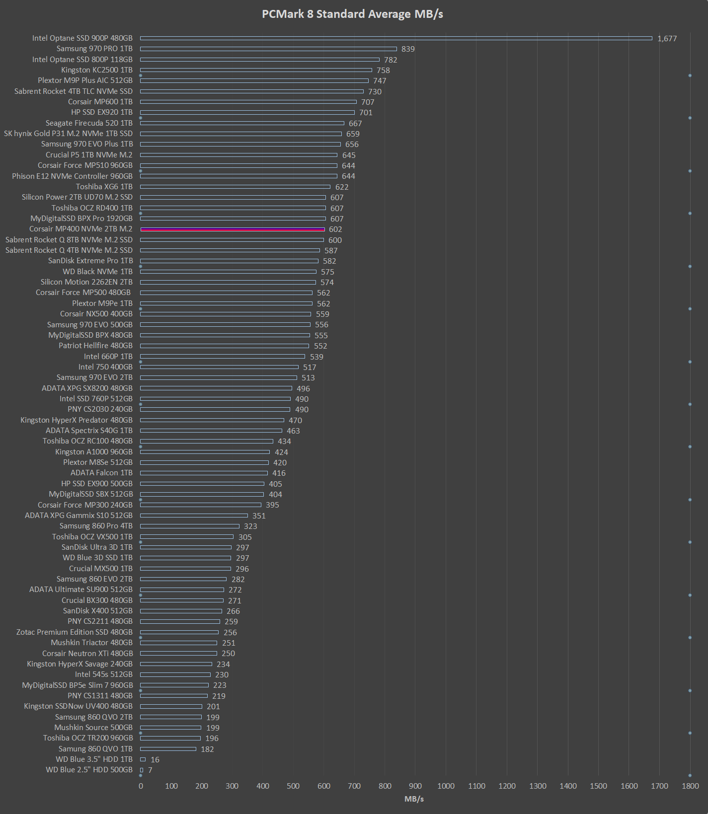 Although the Corsair MP400 didn’t make the Top 10 in our PCMark 8 results, we can see that it is right there with the Sabrent Q, and it did very well overall.