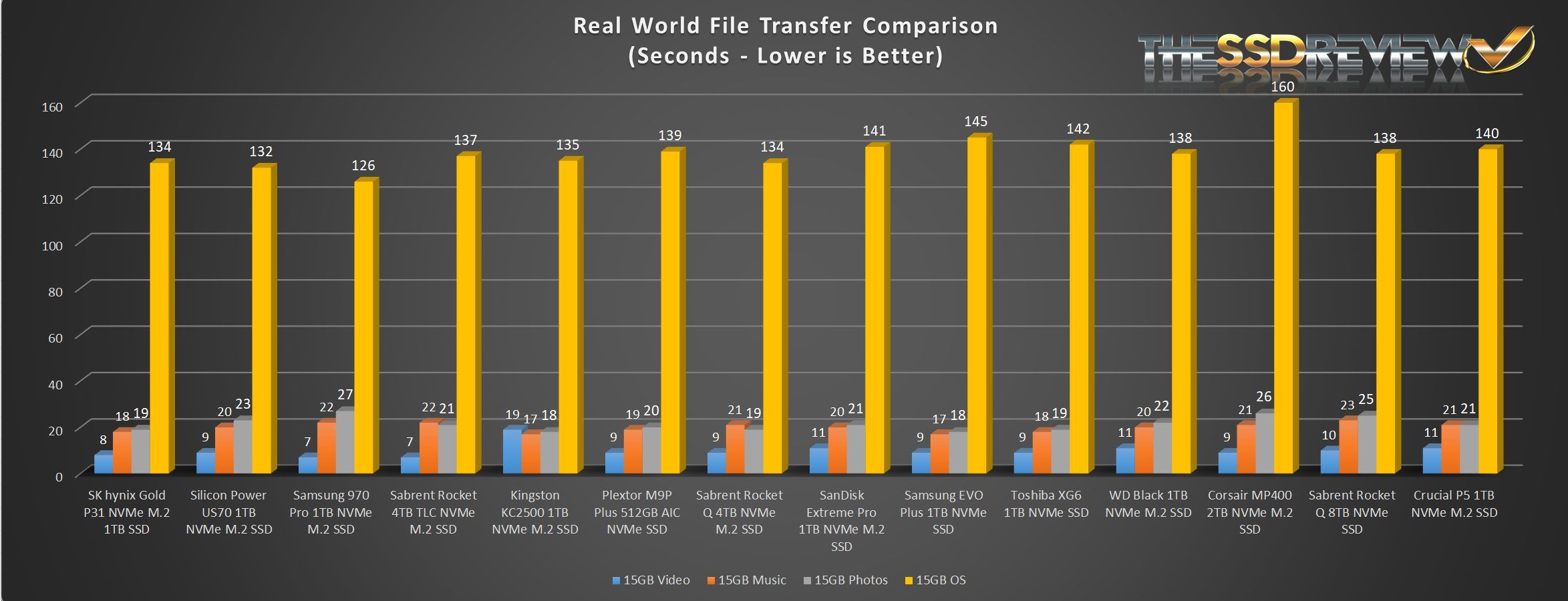 We have put the Corsair MP400 NVMe SSD beside a few of the best PCIe 3.0 SSDs in the business for our true to life data testing. In this test, we simply place 15GB files representing music, video, pictures and operating systems onto the target drive. We then copy each file from one place on the target disk to another, recording the time taken for the transfer.